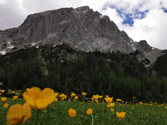 Diese Tour mitten im Karwendel besticht durch ihre Gegensätze. Die schroffen Berghänge des Halltals und die Halleranger Wiesen als Ziel. Auch der Weitwanderweg München - Venedig führt hier entlang.
