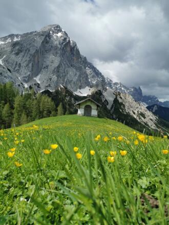 Die hinter der Halleranger-Kapelle aufragende Lafatscher-Nordwand wirkt wie ein riesiges Naturdenkmal.