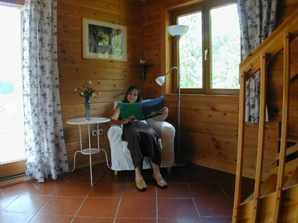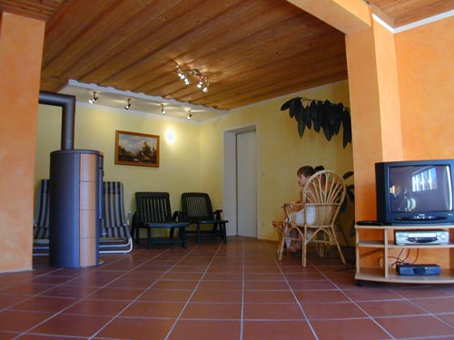 Der zweite Wohnbereich mit seinen rund 55 m2 ist als Relax- und Fernsehraum gedacht. Dieser schließt direkt an den Saunaraum an und wird auch als Ruheraum nach den Saunagängen verwendet. Hier können Sie nach den Saunagängen nebem dem Kaminfeuer mit Sichtfenster ausspannen und den Abend gemütlich ausklingen lassen.