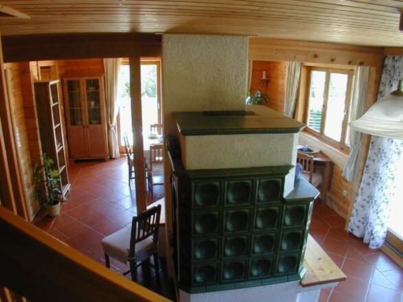 Einer davon dient auch als Essbereich. Dieser grenzt direkt an die Küche an und wurde mit einem Kachelofen und zwei großen Terrassenausgangstüren ausgestattet.