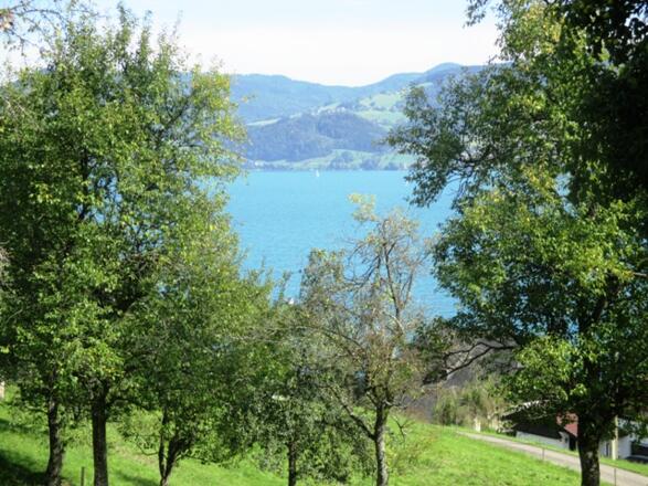 Durch die Lage am Hang haben Sie einen wunderschönen Blick auf den Attersee und das gegenüber liegende Höllengebirge.