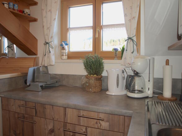 * einer kompletten Küche (E-Herd, Kühlschrank mit Gefrierfach, Mikrowelle, Kaffeemaschine, Wasserkocher, Toaster, Brotschneidemaschine)