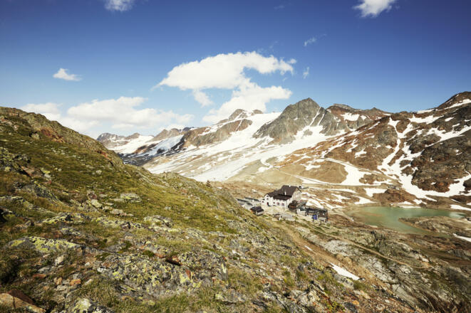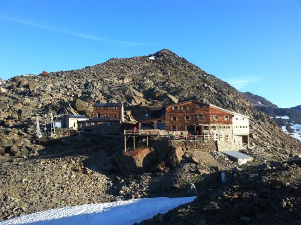 Auf Pfadspuren dem Nordost-Grat ins Hauslabjoch und weiter zur Ötzi-Fundstelle absteigen. Von dort auf markiertem Weg (teils gesicherter Steig) zur Similaunhütte.