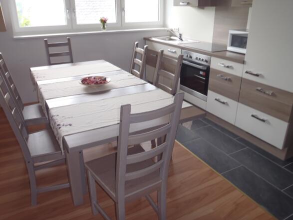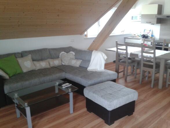 Die Ferienwohnung ist zirka 80m2 gross und verfügt über ein grosses Wohnzimmer und vollausgestatteter Küche mit Esstisch, Kühlschrank mit Gefrierfach, Ceranfeld, Backrohr, Geschirrspueler, Mikrowelle, Kaffeemaschine, Geschirr, ein Schlafzimmer mit Doppelbett und ein Schlafzimmer mit zwei Einzelbetten, Badezimmer mit Dusche und ein WC. Nichtraucherwohnung; SAT TV. Im Erdgeschoss steht eine grosse überdachte Terrasse zur Verfügung und eine Menge an Spielgeräten für kleinere und grössere Kinder (Tischtennis, Ballspielplatz, Sandkiste, etc.)