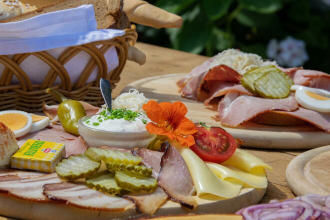 Brettljause / Käsejause / Speckbrot / Surfleischbrot / Selchfleischbrot / Schmalzbrot mit Zwiebel / Schmalzbrot mit Knoblauch / Schmalzbrot / Käsebrot / Topfenkäsebrot / Erdäpfelkäsebrot / Butterbrot / Mehlspeisen nach Tagesangebot