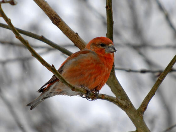 Der gut sperlingsgroße Fichtenkreuzschnabel zählt zu den Bewohnern des tannen- und fichtenreichen Bergwaldes am Hüttersberg. Die auffällig rot gefärbten Männchen und die besser getarnten, gelbgrünen Weibchen turnen oft in schwindeliger Höhe an Fichtenzapfen herum.